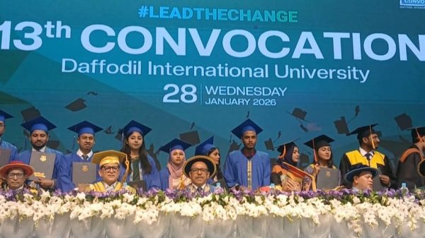 ড্যাফোডিল ইন্টারন্যাশনাল ইউনিভার্সিটির ১৩তম সমাবর্তন অনুষ্ঠিত হয়েছে। আজ (২৮ জানুয়ারী) ঢাকার সাভার উপজেলার বিরুলিয়া এলাকায় নিজস্ব ক্যাম্পাসের মিলনায়তনে সমাবর্তনের উদ্ধোধনী অনুষ্ঠানের আয়োজন হয়। সমাবর্তনে চার সহস্রাধিক শিক্ষার্থী অংশ-গ্রহণ করেন। এ