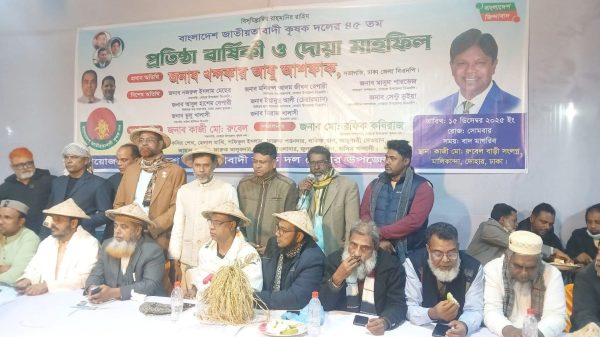 ঢাকার দোহার উপজেলা কৃষকদল আয়োজিত ৪৫ তম প্রতিষ্ঠা-বার্ষিকী ও দেশনেত্রী বেগম খালেদা জিয়ার রোগ মুক্তি কামনায় দোয়া মাহফিল অনুষ্ঠিত হয়েছে। উপজেলা কৃষকদলের সভাপতি কাজী মোঃ রুবেল এর সভাপত্বিতে ও সাধারণ